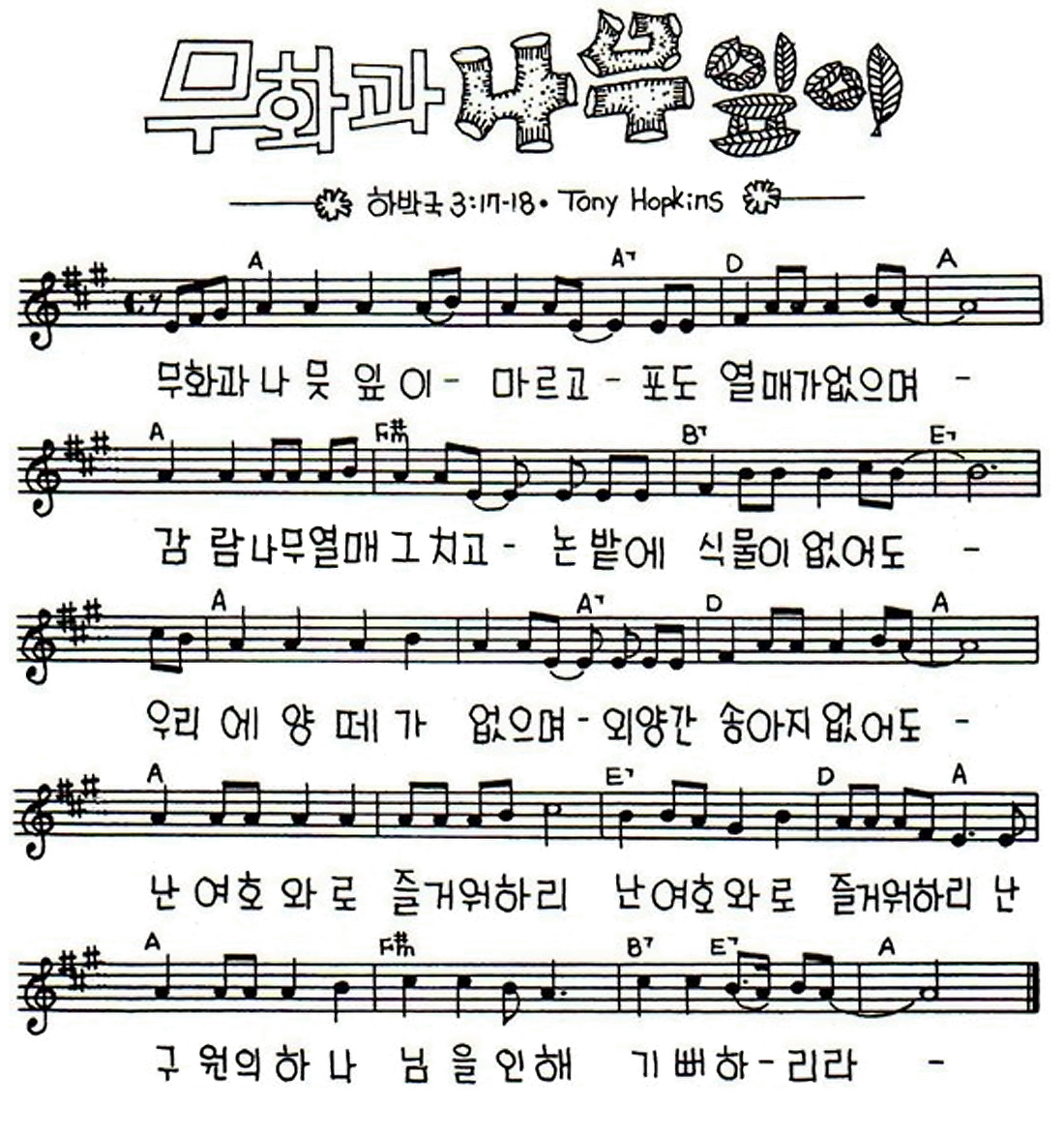 가사는 하박국 3장 17–18절의 메시지를 고백하는 내용으로, “무화과나뭇잎이 말라 열매가 없어도, 나는 여호와로 말미암아 기뻐하리라”는 역경을 초월한 찬양의 메시지가 담겨 있습니다.
