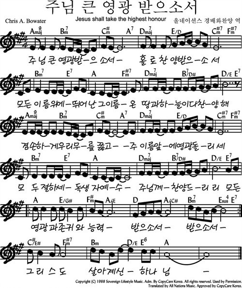 이 찬양의 원제목은 'Jesus Shall Take the Highest Honour' 이며, 지난번 '눈을 들어 주를 보라' 포스팅 때 언급했던 영국의 CCM 저작권 부자 크리스 보워터가 1989년에 발표한 찬양입니다. 보워터의 다른 찬양들이 많이 있다고 말씀드리고 오늘에서야 두 번째 찬양을 소개해드립니다.